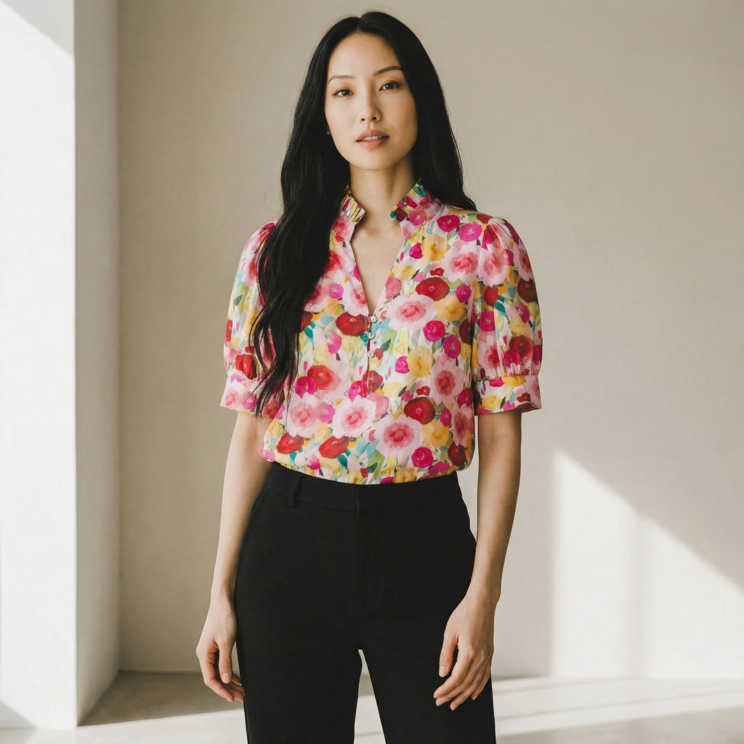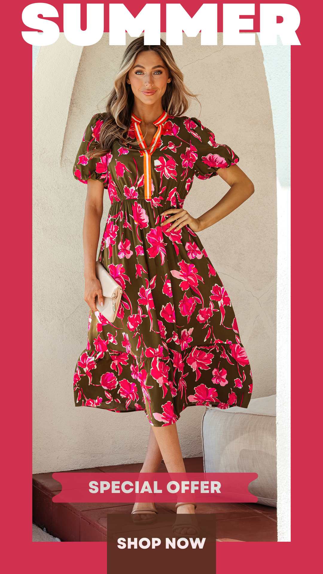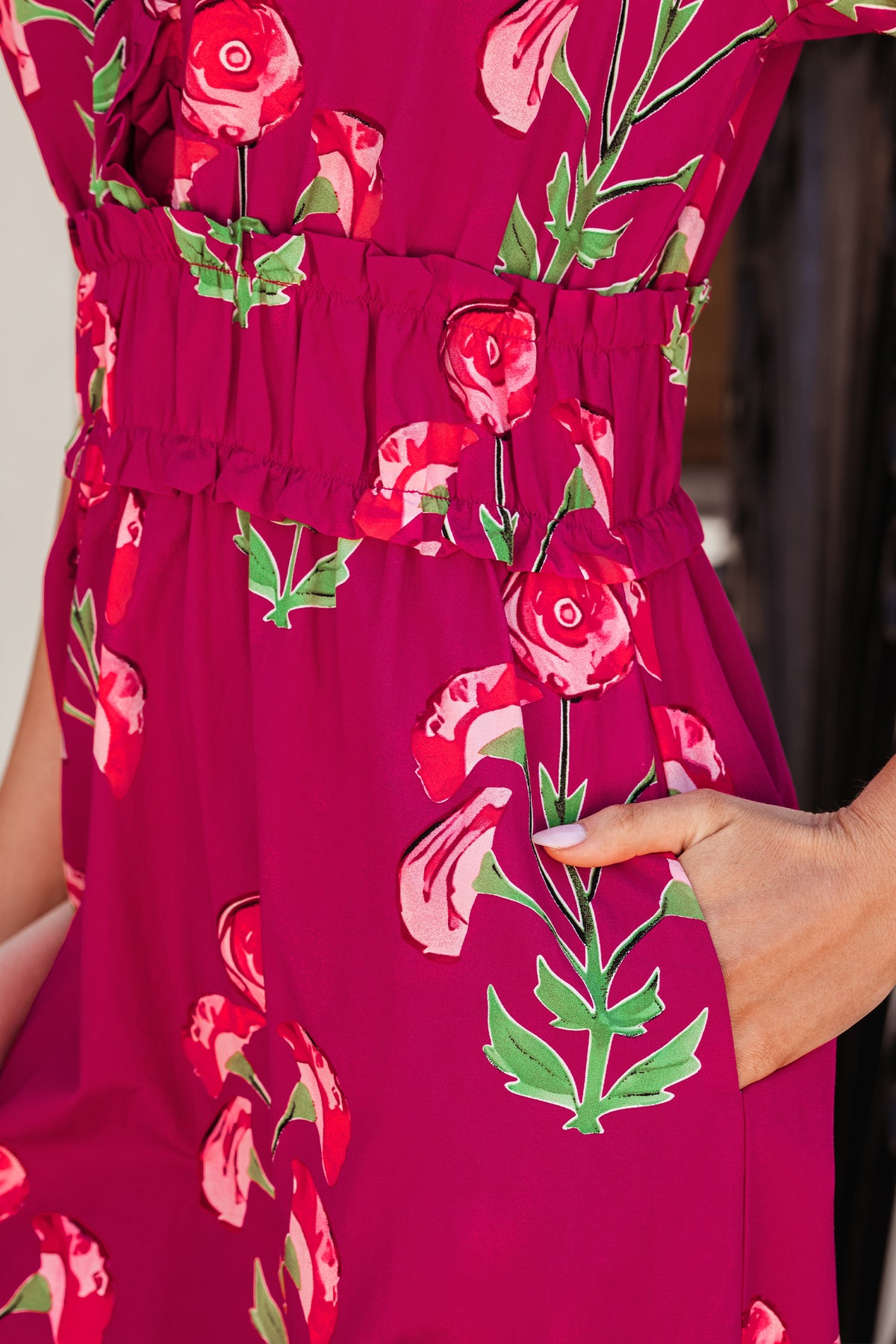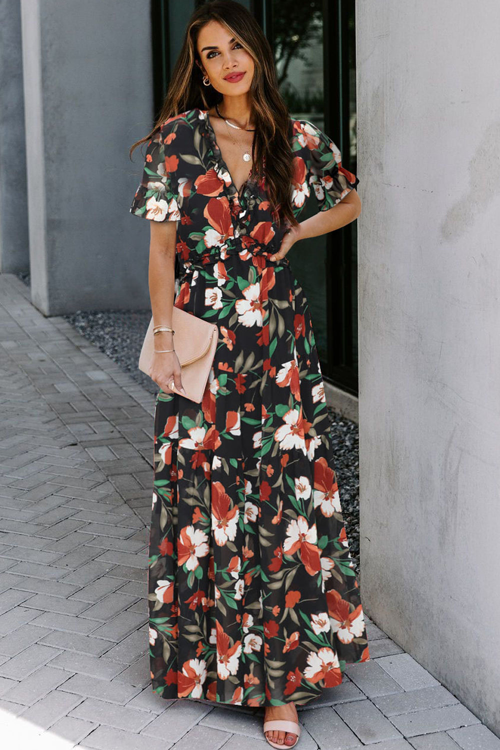 Float through your day in effortless style with this long dress. This dress showcases a beautiful floral print that's simply captivating. It features a charming ruffle collar that extends down the V-neckline. Designed with a flattering ruffle-trimmed elasticized wide waistband.