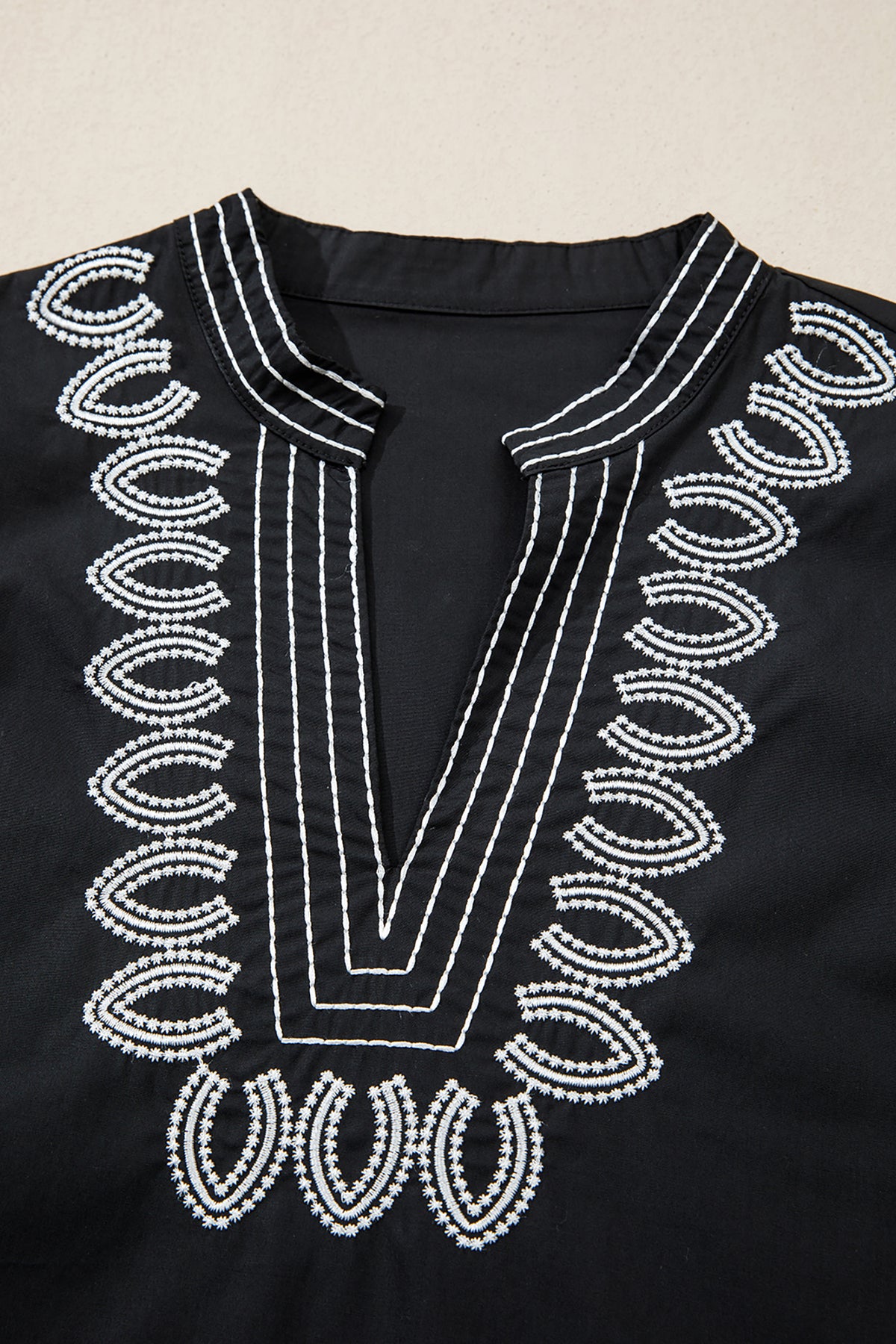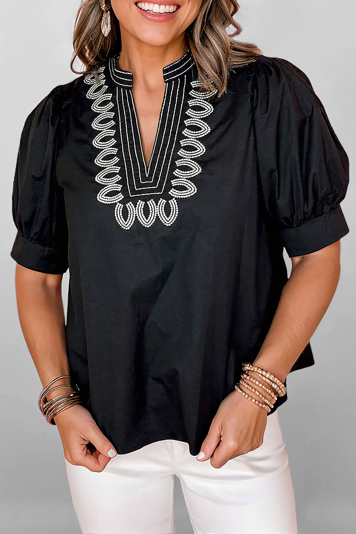 Black Short Puff Sleeve Contrast Embroidered Detail V Neck Blouse