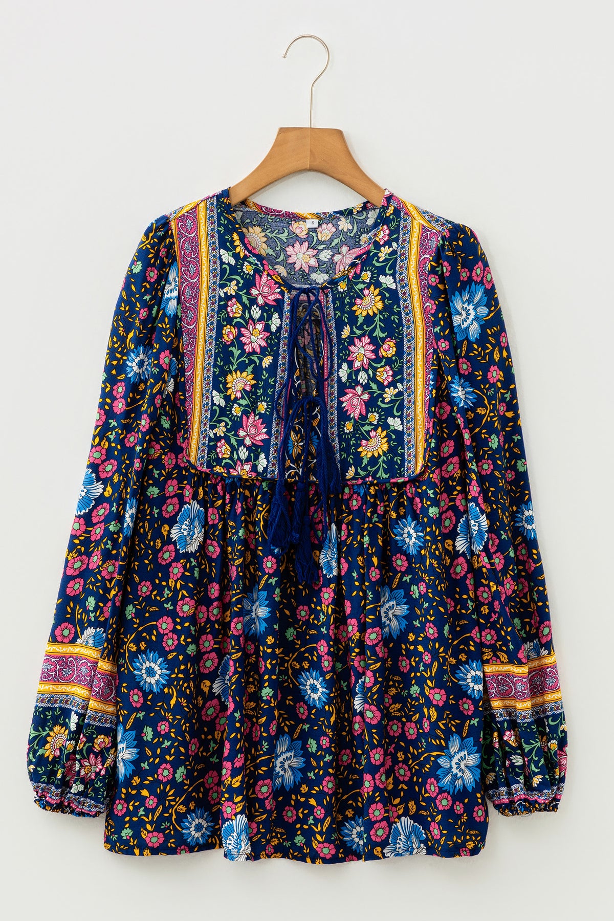 Blue Bohemian Floral Print Tassel Tie Front Long Sleeve Blouse