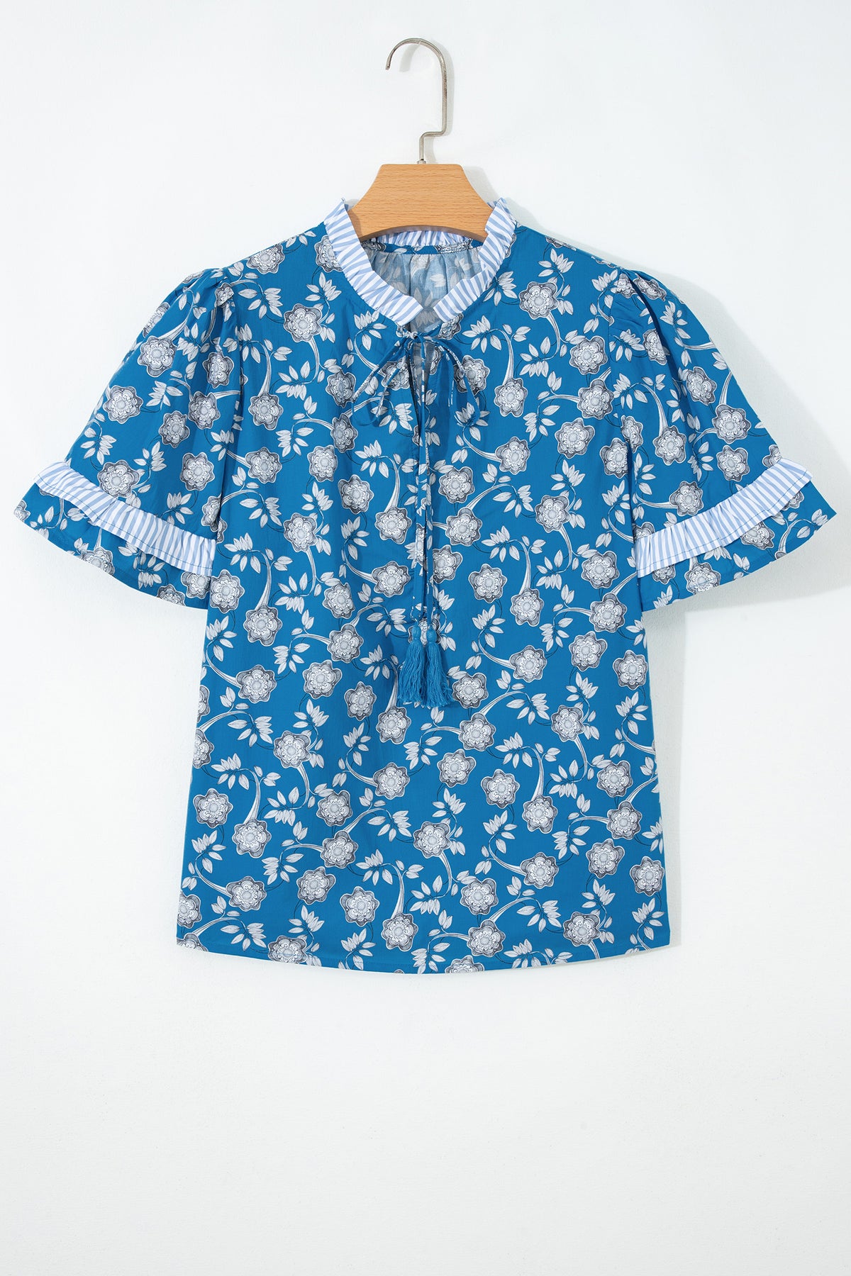 Blue Floral Print Button Tie Neck Striped Detail Short Sleeve Blouse