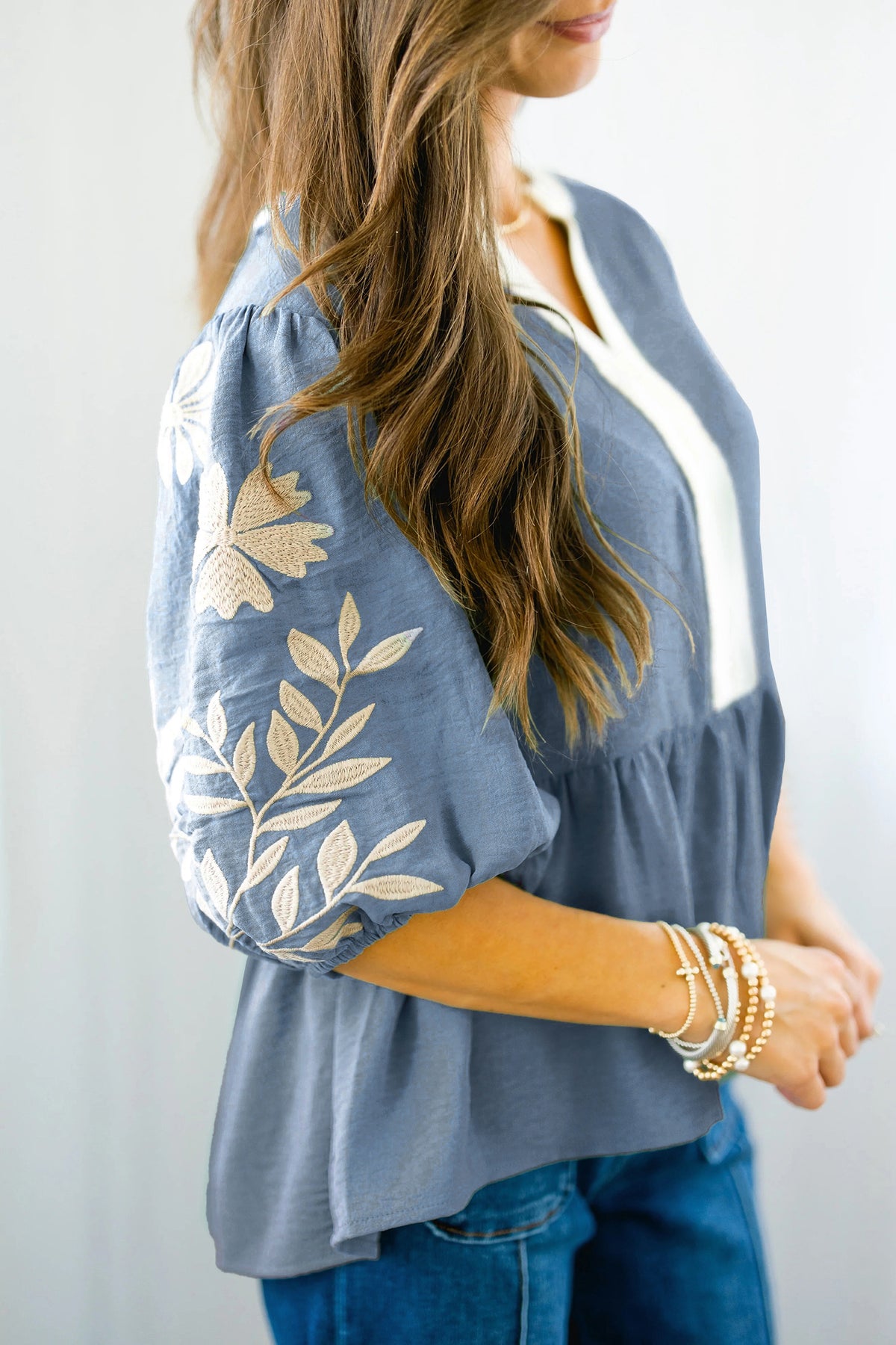 Embroidered detailing brings delicate, feminine charm.