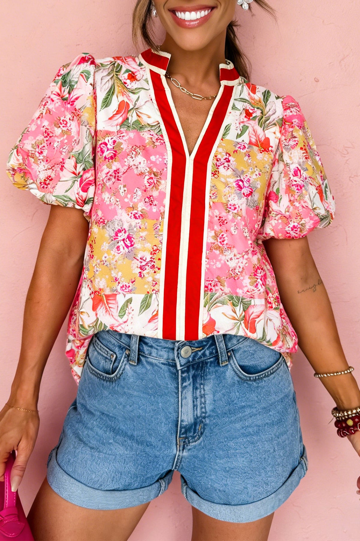 Pink Contrast Collared V Neck Short Sleeve Floral Blouse
