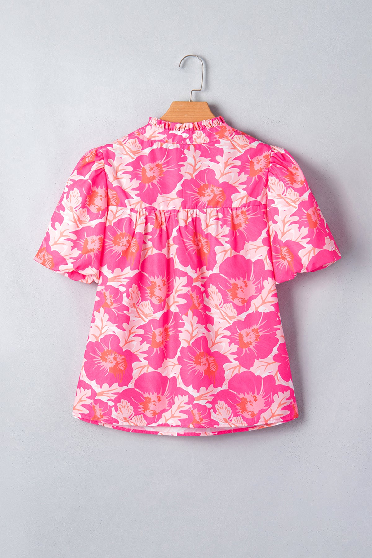 Pink Short Bubble Sleeve Summer Floral Blouse