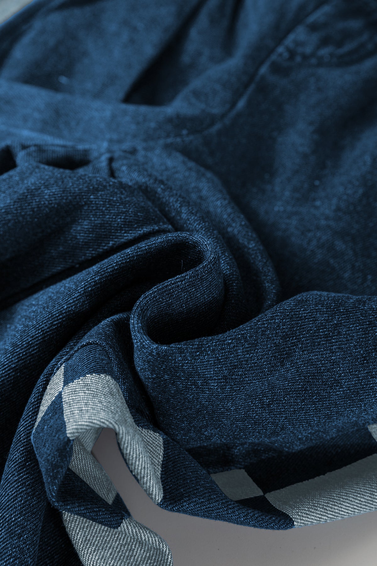 Sail Blue Checkered Side Panel Patchwork Drawstring Loose Denim Pants
