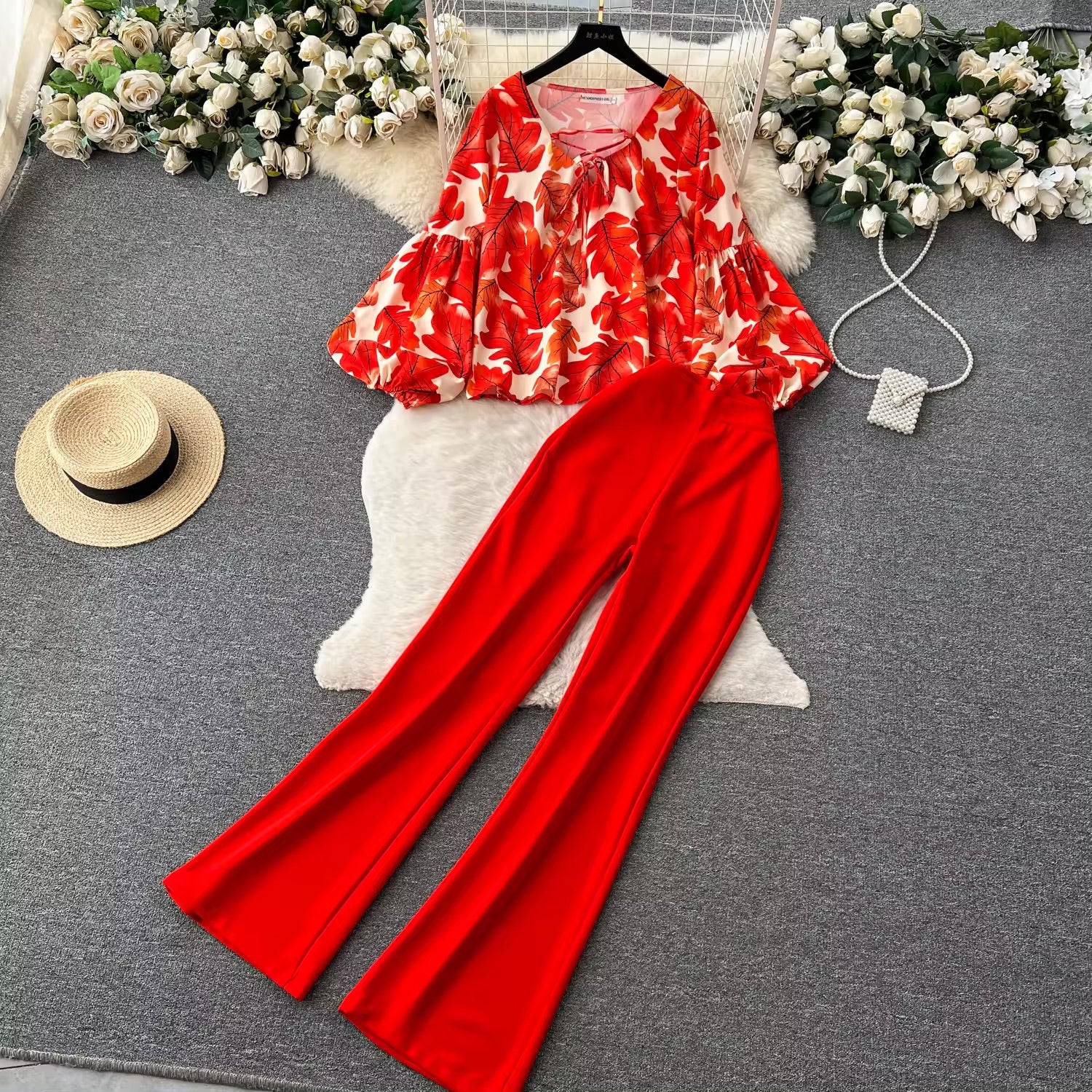 Lantern Orange Print Sleeve Shirt & Casual Pants Set