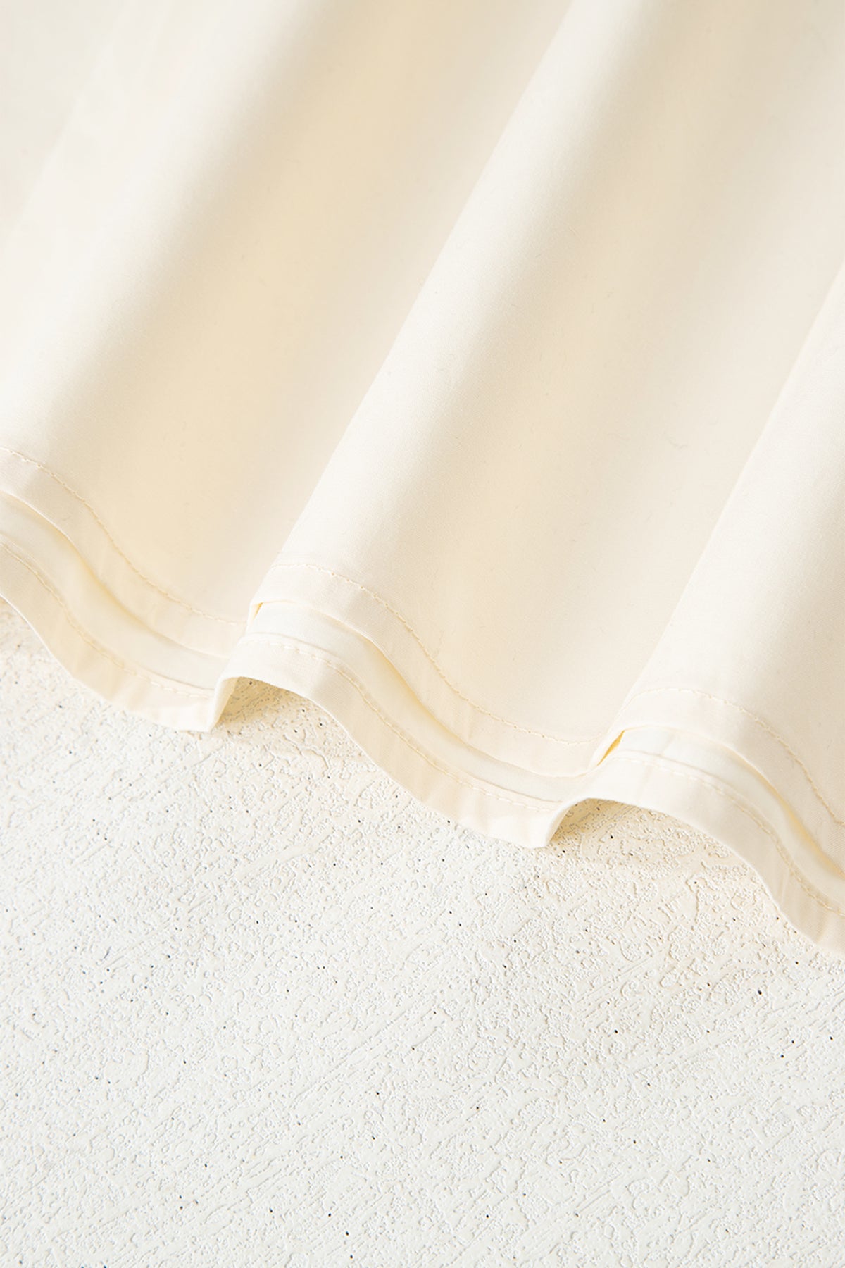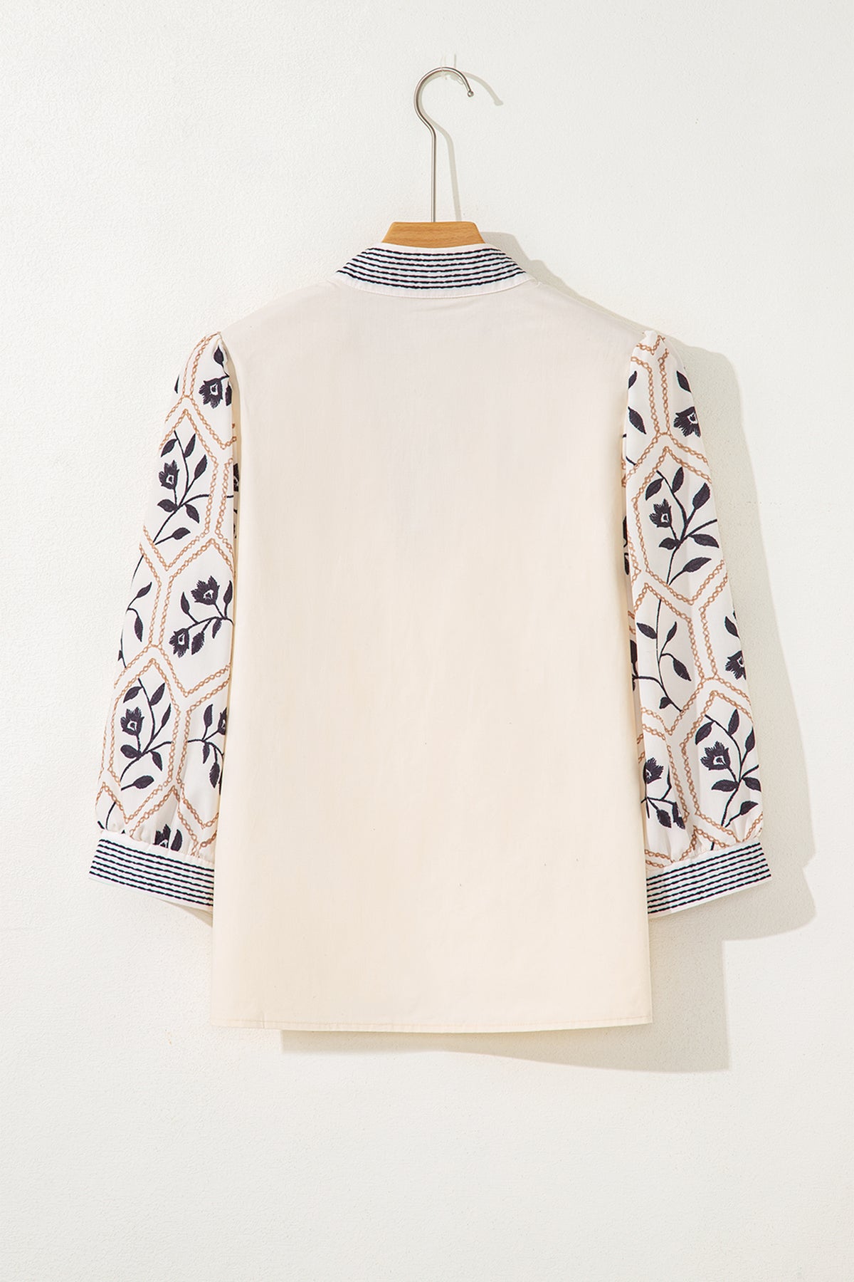 White Floral Puff Sleeve Contrast V Neck Patchwork Blouse