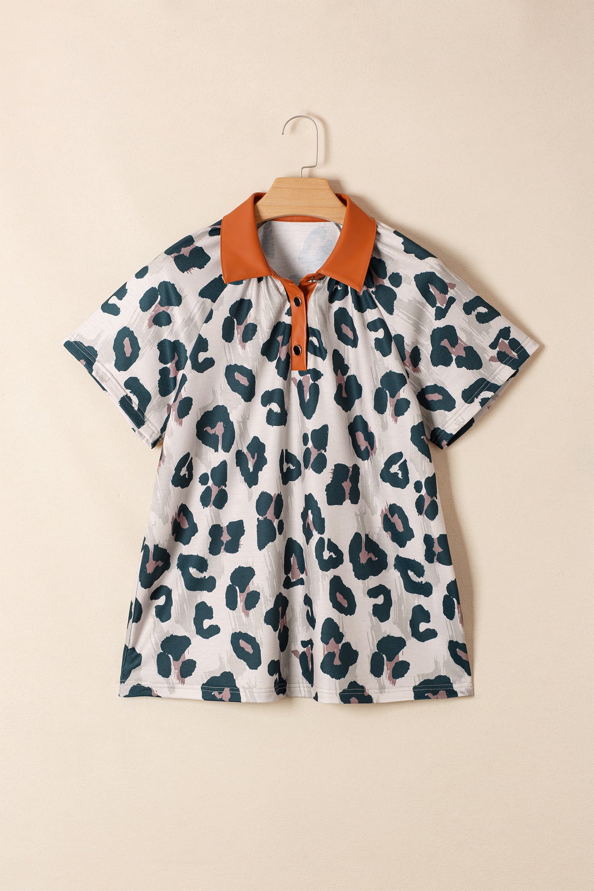 Casual Unique Leopard Print Button Contrast Collared Short Sleeve Blouse