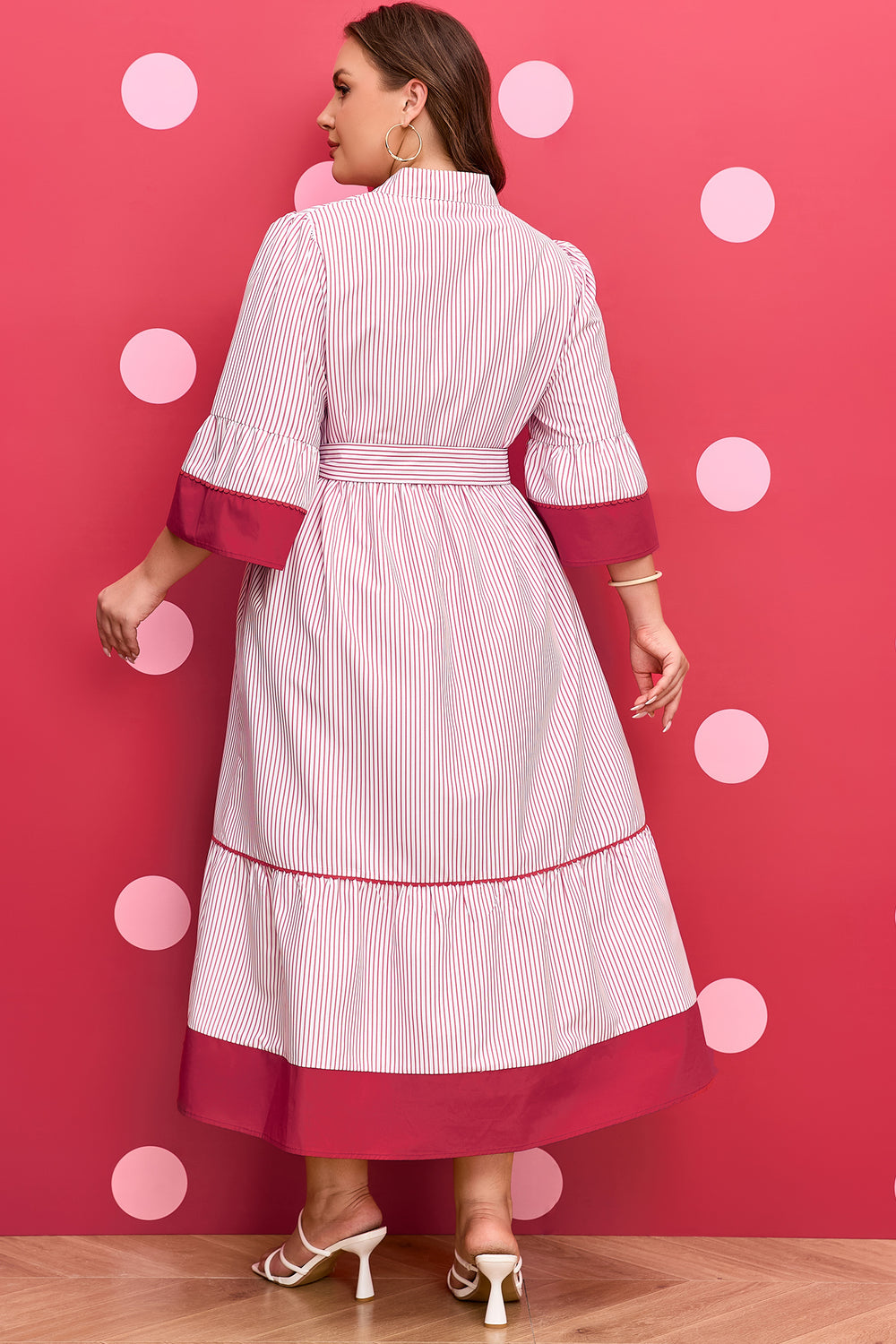 Red Stripe Plus Size Ruffled Hem Pinstriped Midi Dress