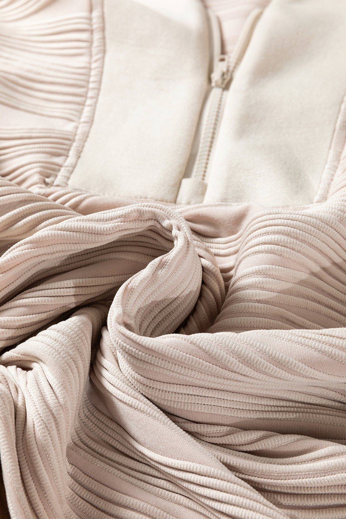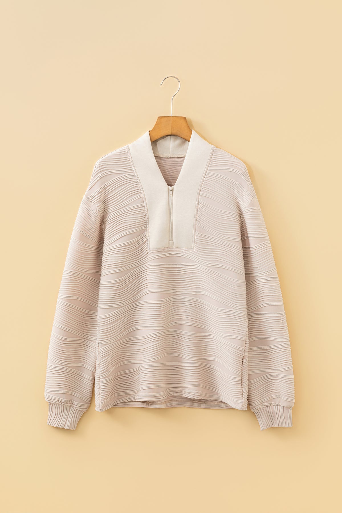 Parchment Solid Color Textured Zip V Neck Pullover Sweatshirt