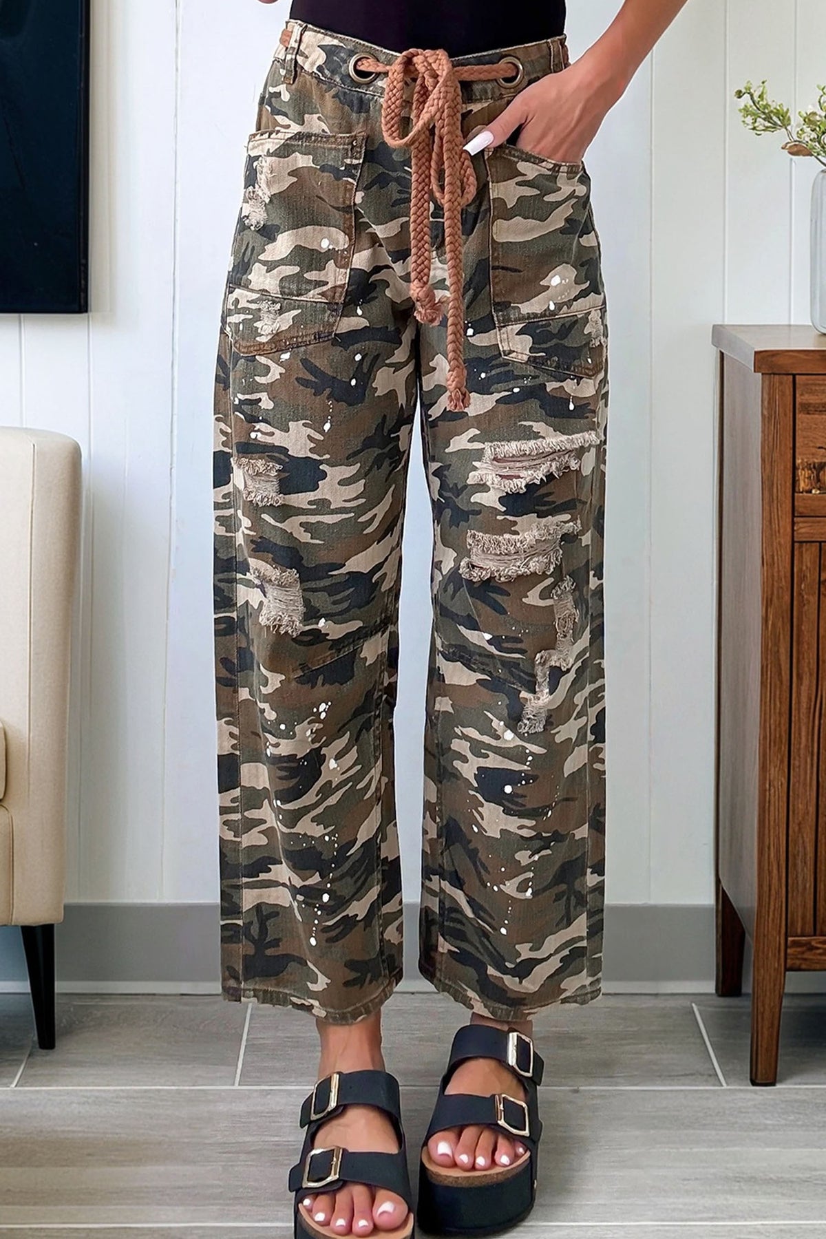 - Camouflage print with splashed details for edgy style.