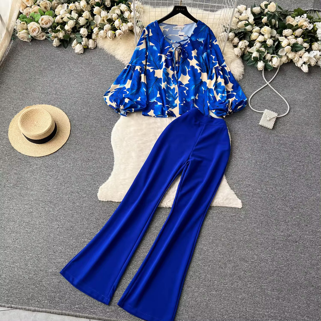 Lantern Blue Print Sleeve Shirt & Casual Pants Set | Women