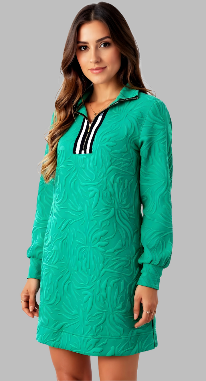 The mini dress is a chic and stylish choice for most daily occasions. The quarter zipper detail adds a modern touch. Jacquard texture provides a unique and elegant feel to this mini dress. The shift silhouette makes it a versatile piece for various body types.